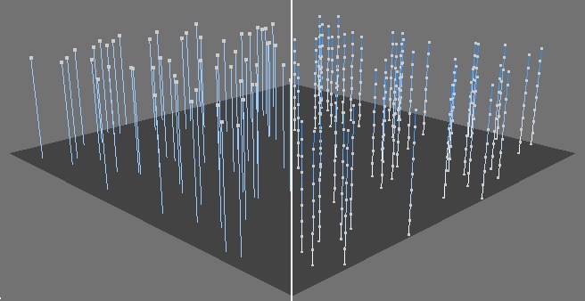 Für die Berechnung der Dynamics ist die Segmentzahl ebenfalls wichtig, da mehr Segmente länger zum Berechnen brauchen und zu insgesamt weicherer Verhaltenweise führen. Außerdem hängt an jedem Segment ein separater Massenpunkt, was die allgemeine Haarmasse vergrößert und zu hängenderem Haar führt.