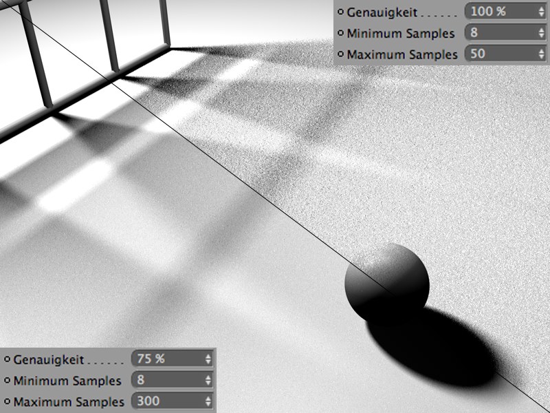 Der zugrunde liegende Algorithmus ist komplex und soll hier nicht Thema sein. Nur so viel: Zum Rendern des Flächenschattens werden Samples benötigt. Je mehr es davon gibt, desto homogener (unkörniger) wird das Rendering, aber desto größer ist die Renderzeit und umgekehrt.
