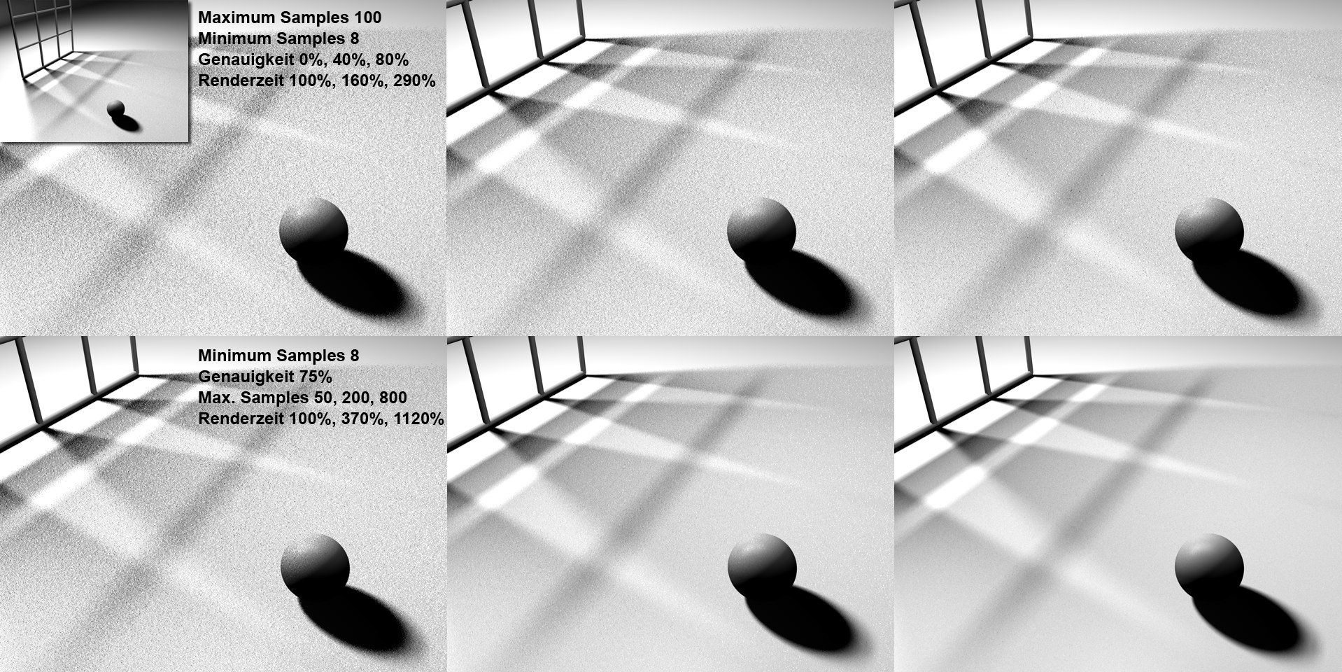 Variierter Parameter Genauigkeit (oben) und Maximum Samples (unten). Oben links das schattenwerfende Gitter, das mit einer Flächenlichtquelle beleuchtet wurde.