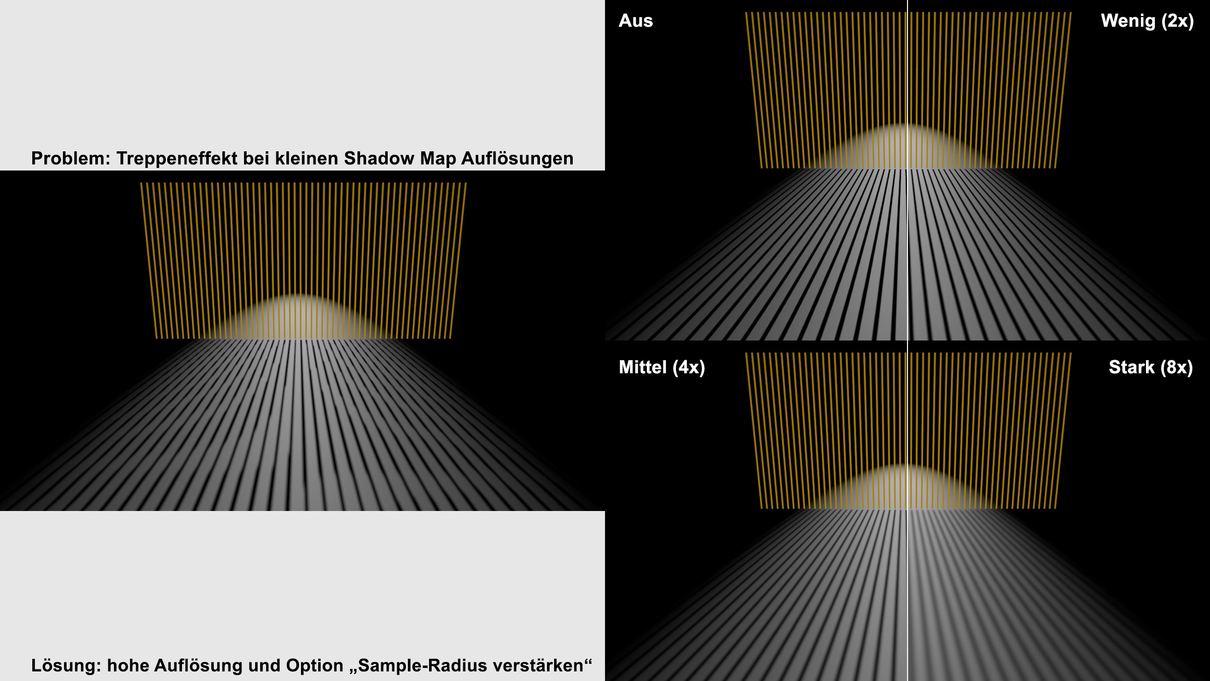 Der Sample-Radius bestimmt die Genauigkeit, mit der Shadow Maps berechnet werden. Je höher der Sample-Radius, desto genauer der Schatten, aber desto größer die Berechnungsdauer. Wenn Sie aus Speichergründen kleinere Shadow Maps benutzen müssen, können Sie den Sample-Radius größer wählen, damit die Qualität des Schattens verbessert wird.
