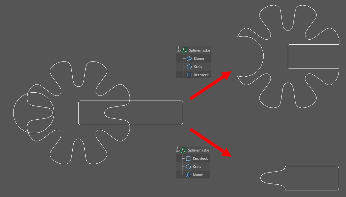 Bei einigen Modi – wie den Subtraktions-Modi – ist der Ziel-Spline wichtig, bei anderen (z.B. Vereinigen) nicht, dort ist die Reihenfolge der untergeordneten Splines dann egal.