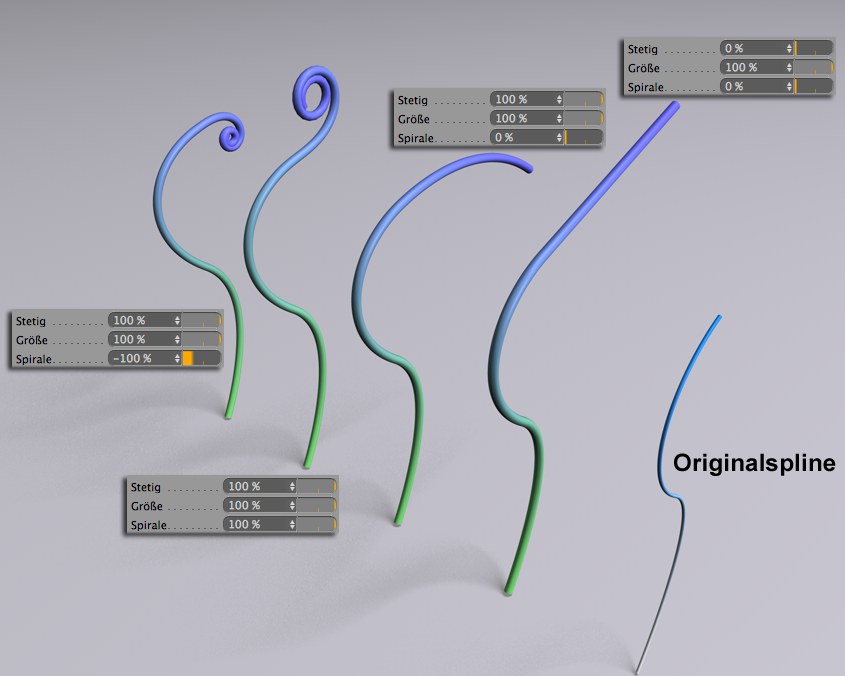 Den Effekt dieses Parameters sehen Sie am besten, wenn Sie Spirale auf 0% setzen. Er definiert nämlich, ob der MoSpline geradlinig über die Grenzen hinaus verschoben wird (0%) oder eine kreisartige Krümmung annimmt, die der letzten Splinepunkttangenten entspricht (100%).