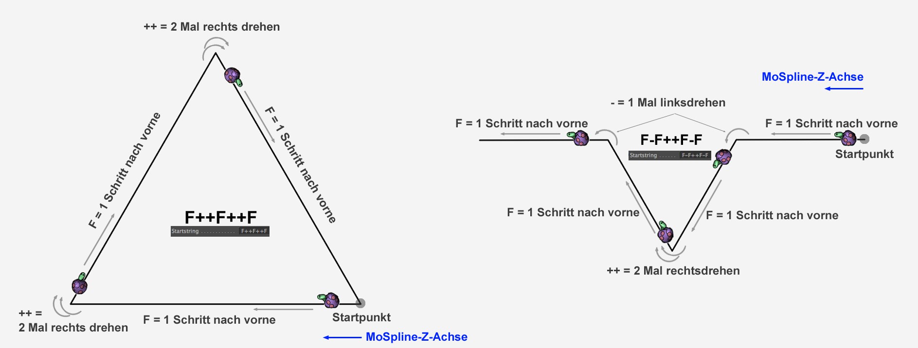 Wenn Sie bei Startstring also die Zeichenfolge F++F++F eingeben, bedeutet das im Klartext: (ausgehend von der positiven Z-Achse) "Gehe einen Schritt nach vorne, drehe Dich 2 Mal nach rechts, gehe wieder einen Schritt nach vorne, drehe Dich nochmals 2 Mal nach rechts und noch einmal einen Schritt nach vorne."