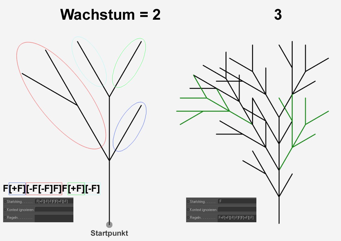 Vereinfacht gesagt, gibt es in einem L-System eine Abfolge von Anweisungen, die definieren, wie und wo neue Zweige wachsen. Das ganze ist ein selbstreproduzierendes System, das bestehende Zweige durch neue ersetzen kann.