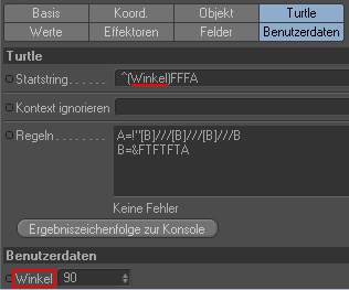 Sie können Benutzerdaten verwenden, um diese als Variablen in einer Zeichenfolge zu verwenden. Bei obiger Abbildung wurde bei den Benutzerdaten ein Winkel definiert, der dann einfach oben in Klammern für "^" (Turtle um Querachse drehen) eingesetzt wurde.