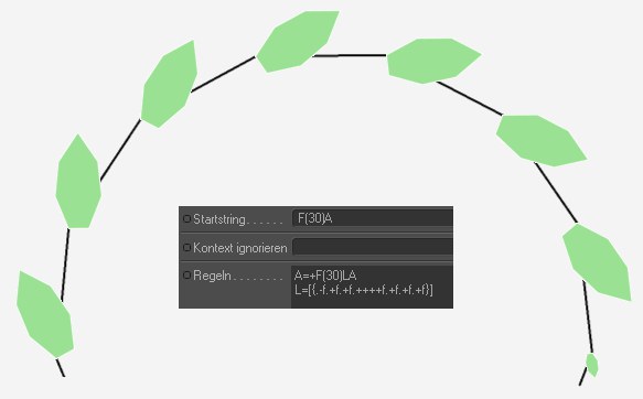 Innerhalb der geschweiften Klammern (diese erzeugen ein Polygon) werden eine Anzahl Polygonpunkte (jeweils eingeleitet mit einem ".") festgelegt, zwischen denen das Polygon erzeugt wird. Dadurch, dass die geschweiften Klammern zusätzlich noch in eckigen Klammer eingefasst sind, wird die Turtle nach der Blattzeichnung jeweils an den Punkt vor Beginn der Blattzeichnung zurück gesetzt.