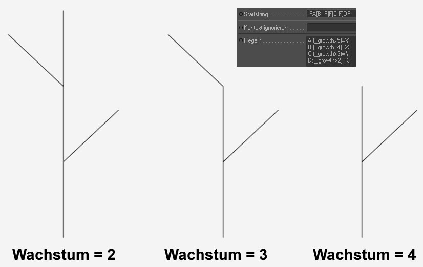 Wenn Sie sich dieses Beispiel betrachten, sind im Startstring die Platzhalter A, B, C und D verteilt. Die Regeln definieren jetzt für verschiedene Wachstum-Werte das Ersetzen der jeweiligen Platzhalter mit einem "%", das bedeutet, ab dieser Position werden im (und pro) Zweig die folgenden Zeichen weggeschnitten.