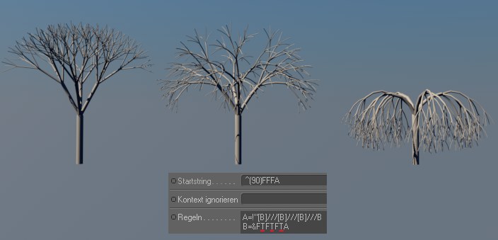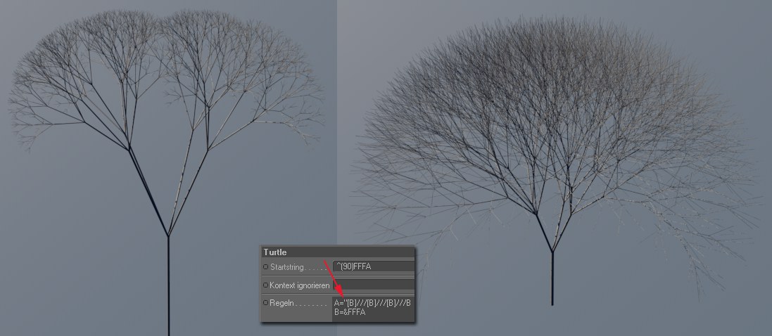Wenn Sie in der Zeichenfolge ein oder mehrere "T" unterbringen (wie es in der voreingestellten Regel B=&FTFTFTA der Fall ist), wird die jeweils darauf folgende Linie in Richtung der Welt-Y-Achse (also nach unten) gebogen. Bei einem baumähnlichen L-System würde der Baum die Äste hängen lassen (wie es eben auch oft bei tropischen Bäumen der Fall ist, daher der Parametername).