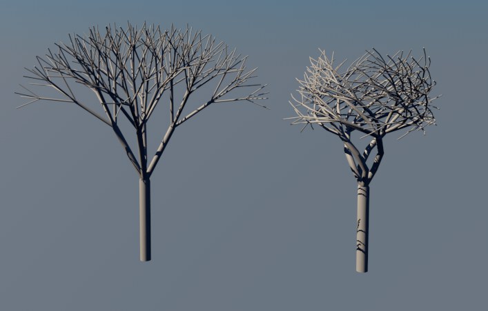 Links kein wirkender Tropismus, rechts Tropismus im Zusammenhang mit einem Die Tropismusrichtung kann auch mittels der Partikelsystem-Modifikatoren beeinflusst werden. Anstatt, dass Zweige dann einfach nach unten hängen, wird je nach Partikel-Modifikator das Herunterhängen vollständig beseitigt und "T" quasi komplett an den Modifikator und dessen Stärke übergeben.
