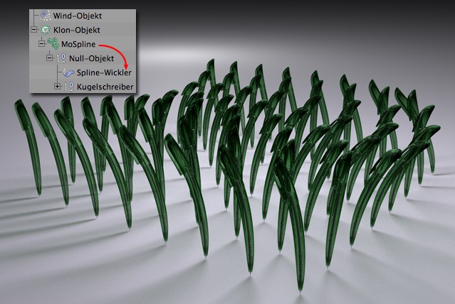 Spline-Wickler mit einem MoSpline füttern. So können sich beliebige Objekte beispielsweise sanft im Wind wiegen, da die Partikel-Modifikatoren auf MoSplines wirken: