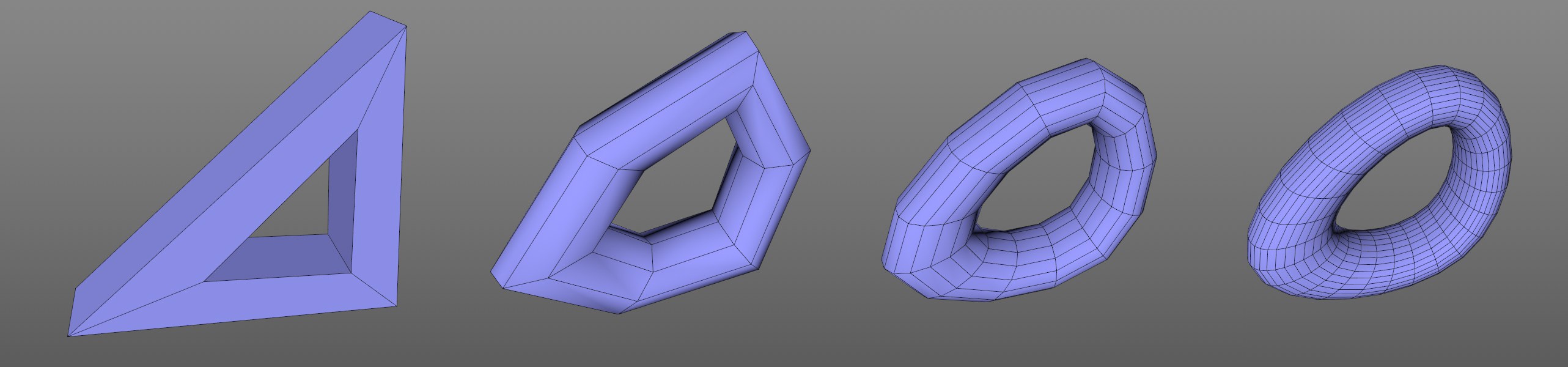 Ausgangsobjekt, Subdivision-Surface-Unterteilung 1,2 und 3