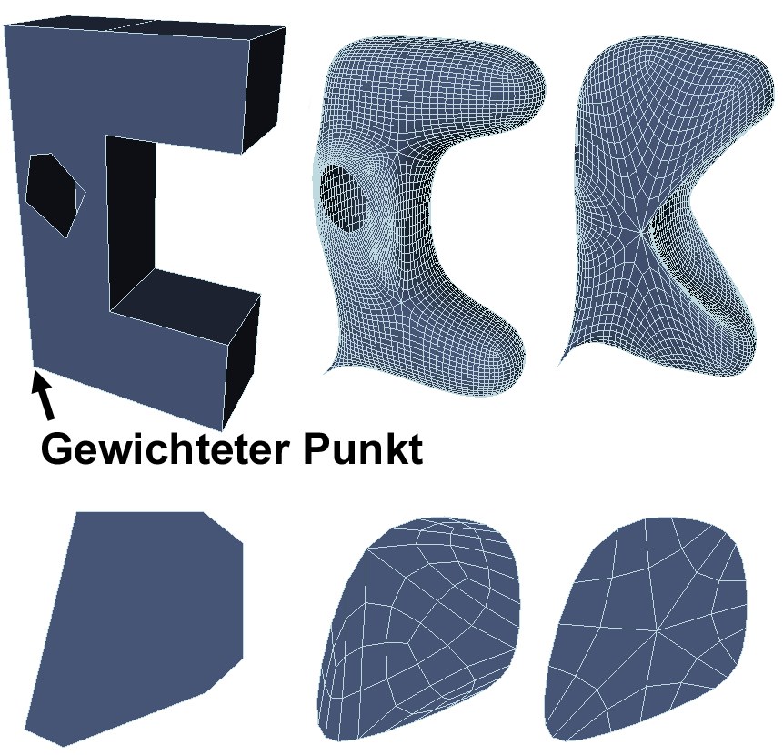 - Wichtungen wirken sich bei den OpenSubdiv-Typen im Detail etwas anders aus. Im Großen und ganzen ähnlich, aber doch unterschiedlich. Der größte Unterschied ergibt sich bei den Punktewichungen, die im Extremfall nicht in Spitzen enden: