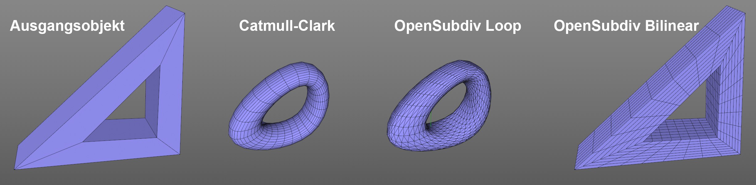 N-Gons werden erst nach interner Triangulation unterteilt. Punkte-, Kanten- und Polygon-Wichtungen werden unterstützt. Wenn Sie Subdivision Surfaces (bzw. LowPoly-Modelle) in andere Programme exportieren wollen, fahren Sie mit diesem Typ am sichersten, da Catmull-Clark weit verbreitet ist und das geglättete Objekt dort annähernd gleich beschaffen sein wird.