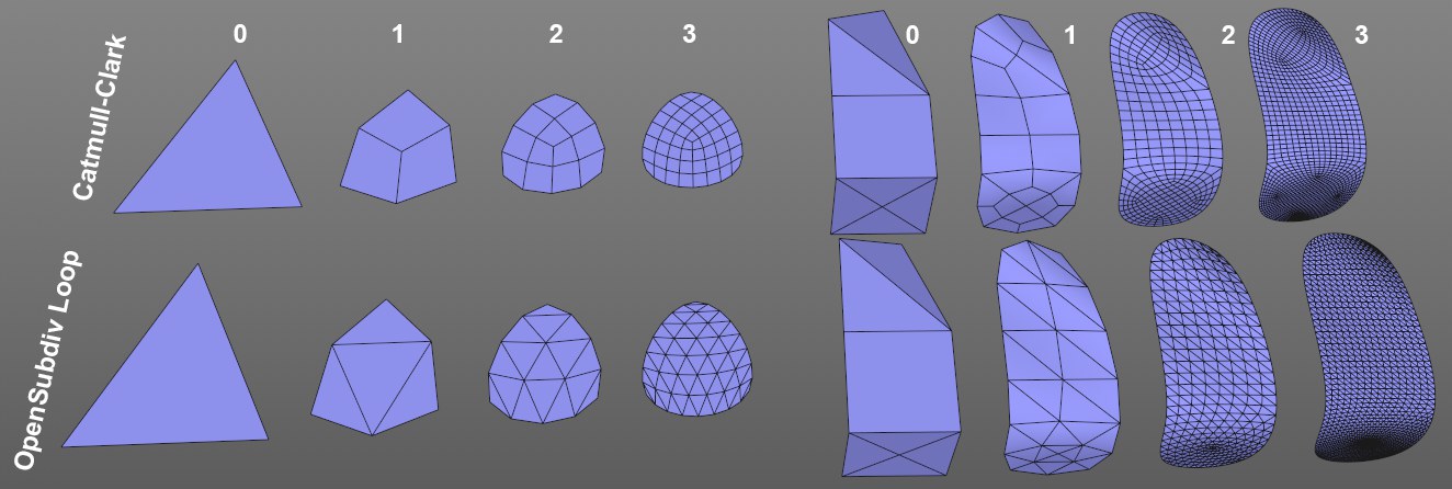 So unterteilen Catmull-Clark (oben) und OpenSubdiv Loop(unten) mit verschiedenen Unterteilungen und Objekten.