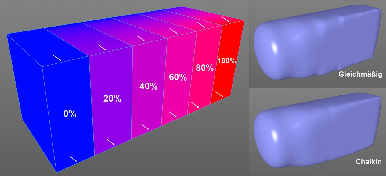 Mittels dieser Einstellung kann der Übergang verschieden stark gewichteter Kanten zueinander beeinflusst werden. Bei Gleichmäßig ist die Glättung über die einzelne Kante ziemlich konstant, was die Übergänge zwischen verschiedenen Kantenwichtungen abrupter geschehen lässt, während bei Chalkin versucht wird, die Glättung homogener ineinander übergehen zu lassen.