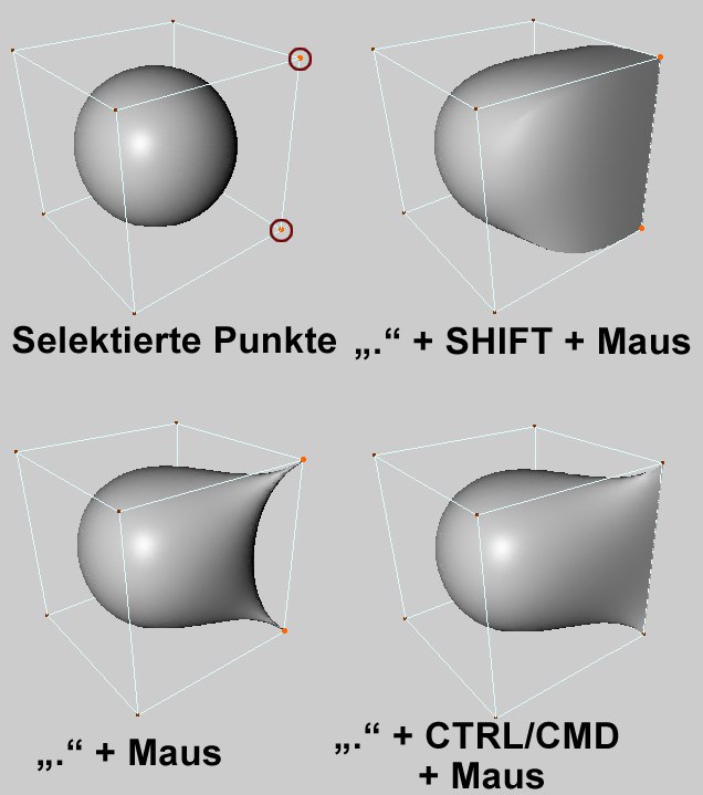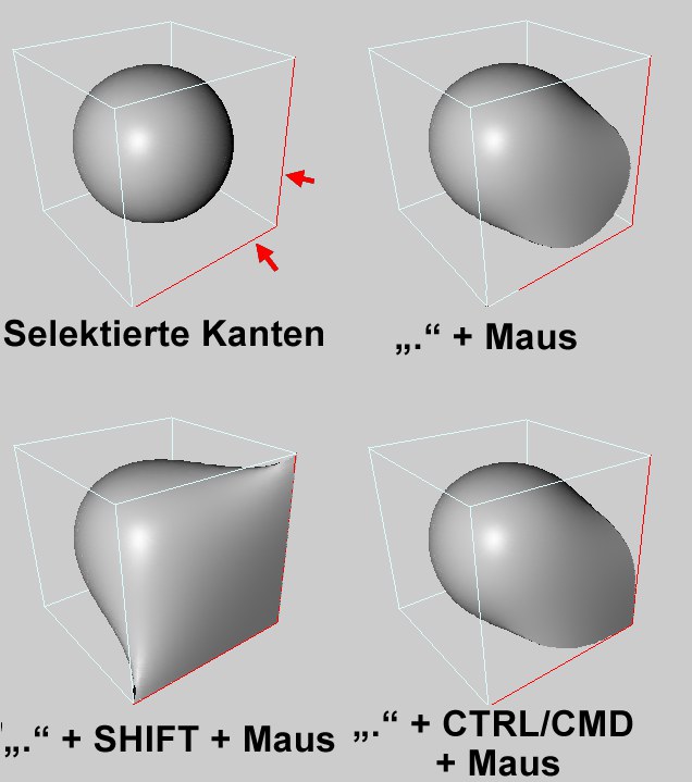 .+ Ctrl/Cmd + Maus: Wichtung von selektierten Punkten und evtl. dazwischen liegenden Kanten (deren Eckpunkte müssen selektiert sein)