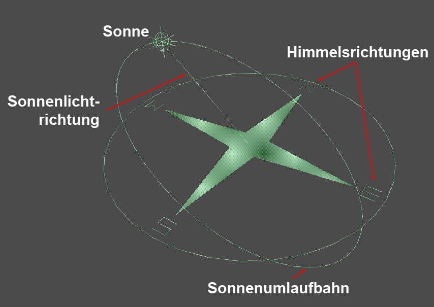 Die aktivierte Option sorgt dafür, dass im Ursprung des Himmel-Objekts eine Kompaßrose inkl. stilisierter Sonne samt ihrer Umlaufbahn eingeblendet wird. So können Sie auf einen Blick Himmelsrichtungen und Sonnenstand (und damit den sehr wichtigen Sonnenschatten) abschätzen.