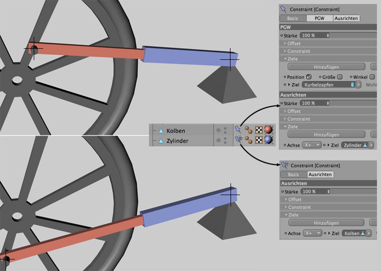 Der Zylinder benötigt dann nur noch ein Constraint-Tag mit einer Ziel-Beschränkung, die auf den Drehpunkt des Kolbens (oder des Kurbelzapfens) zielt. Beachten Sie die Auswertereihenfolge von Constraints, die sich voreinstellungsgemäß nach der Reihenfolge im Objekt-Manager richtet. Wenn Sie in obigem Beispiel den Zylinder im Objekt-Manager nach oben (über den Kolben) verschieben, werden die Ergebnisse nicht korrekt sein (es sei denn, Sie greifen direkt in die Expression-Priorität ein, s. hier).