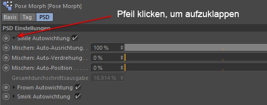 Befinden Sie sich im Animations-Modus und haben korrigierende PSD-Morphs erzeugt, finden Sie hier zusätzliche Optionen. Diese definieren, wie jedes Morph automatisch gesteuert wird. Klicken Sie auf die kleinen Pfeile, um die Parameter jedes posengesteuerten Morphs aufzuklappen. Für jedes Morph sollte zumindest einer der Parameter größer 0% sein, damit das automatische Steuern wirken kann.