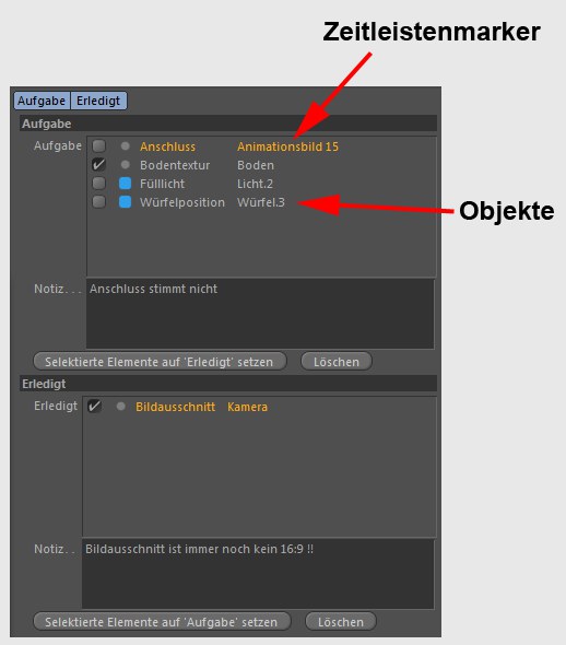 Wenn verschiedene Leute an größeren Projekten arbeiten, ist es oft nötig, Elemente mit Kommentaren zu versehen, wenn an diesen Nacharbeiten nötig sind. In CINEMA 4D geschieht das an 2 Orten: