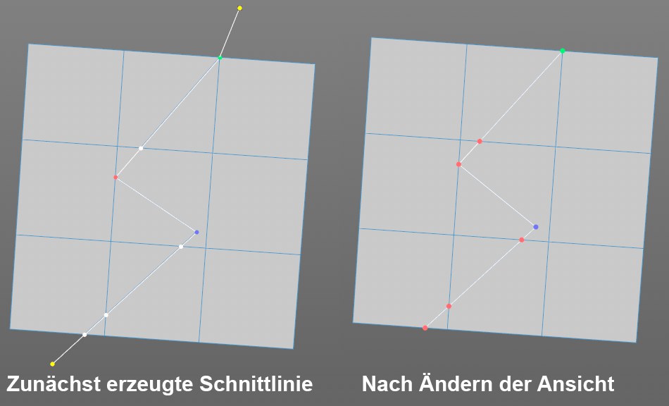 Die Schnittlinie wird in Blickrichtung auf das zu schneidende Objekt projiziert. Sie kann auf Polygonen, Kanten und Punkten einrasten oder auch frei im Raum angelegt werden.