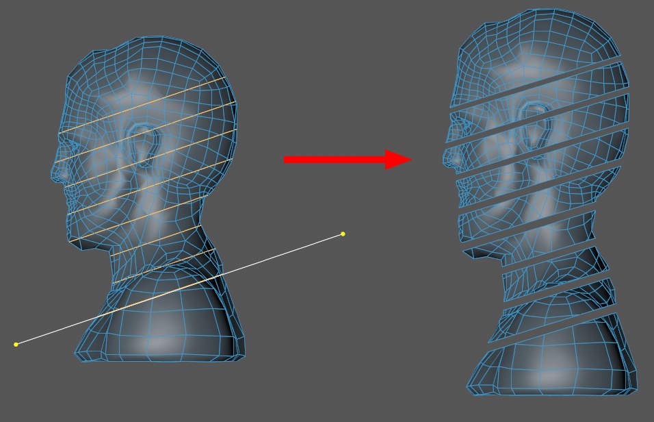 Der Ebenenschnitt ist primär für technisches und weniger organisches Modellieren vorgesehen und schneidet dabei polygonale Objekte in allen 3 Komponentenmodi (Punkte, Kanten, Polygone).
