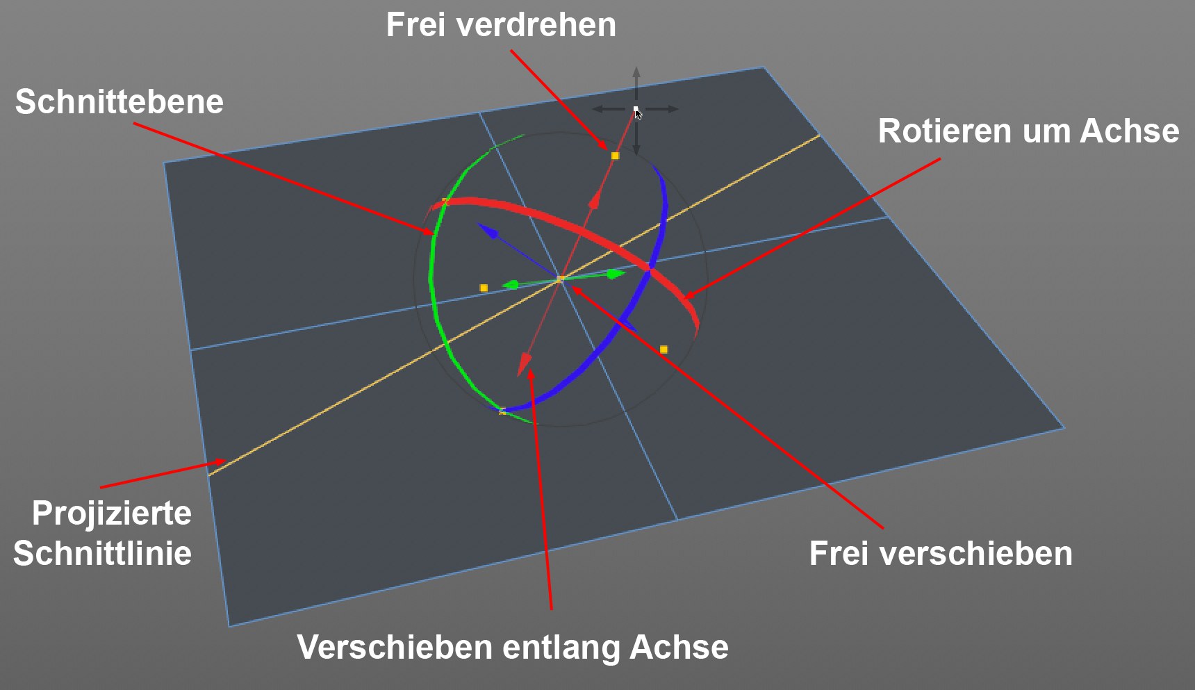 Ändern Sie die Ansicht (in anderen Ansichten ist er sowieso schon eingeblendet) oder die Werte von Ebenenposition oder -winkel im Attribute-Manager, wird die Ebene durch einen Manipulator ersetzt, mit dem Sie die Schnittebene (sie liegt im grünen Rotationsband) frei positionieren und ausrichten können: