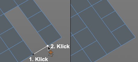 Durch Anklicken zweier Punkte, die Bestandteile einer Randkante sind, wird ein Polygon aus der Randkante und der zwischen diesen beiden Punkten liegenden Fläche gebildet (das funktioniert nicht im Polygonmodus):