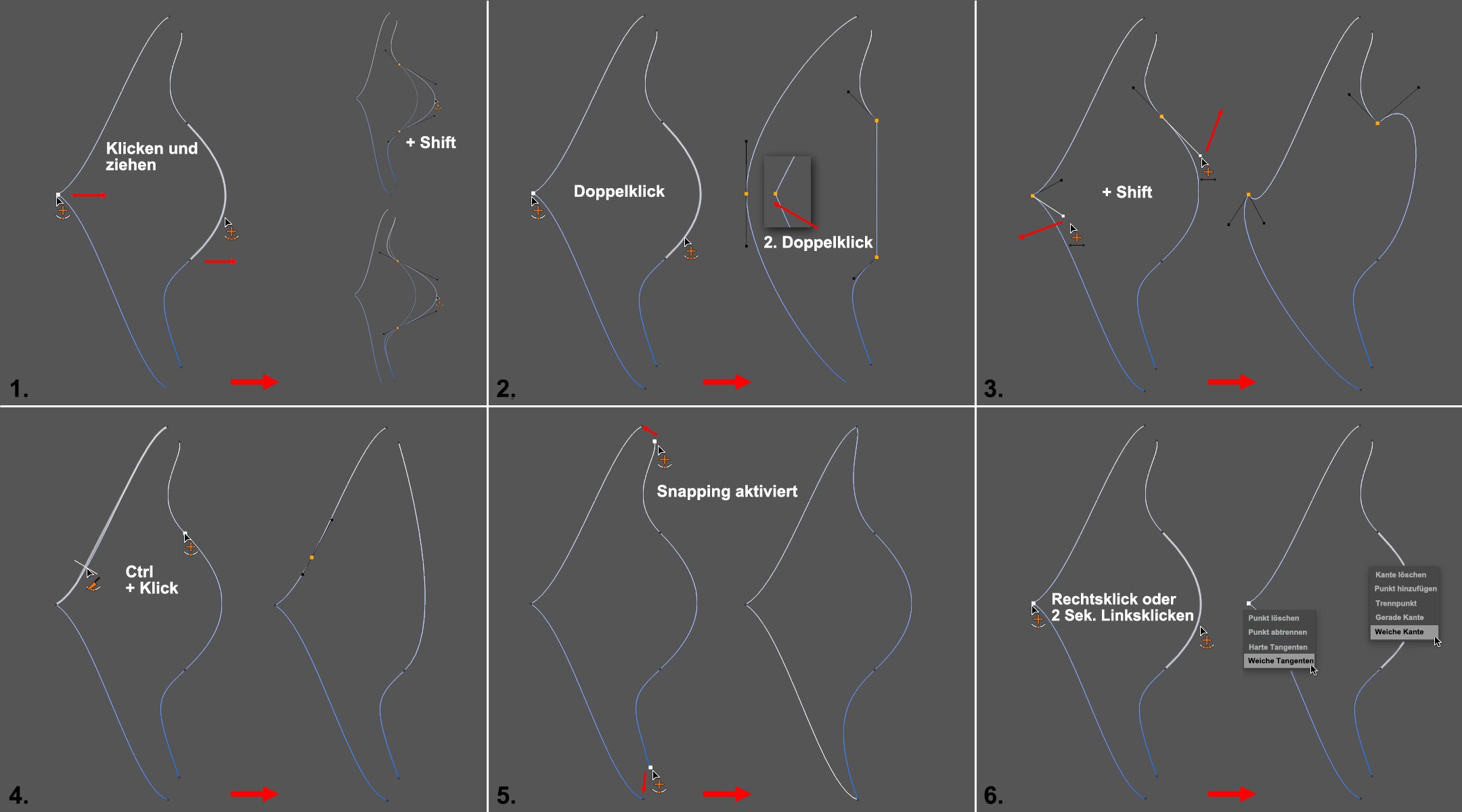 - Harte Tangente: Setzt die Tangentenlänge bei Bézier-Splines auf 0, erzeugt also einen Knick.
