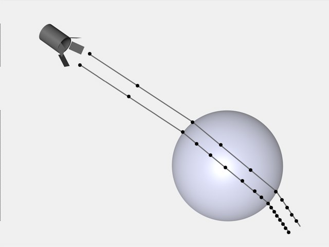 Angenommen, ein für die Volumen-Caustics vorgesehener Spot hat eine wirksame Lichtkegellänge (Caustics / Abnahme / Äußere Distanz) von 100. Wenn Sie jetzt eine Schrittlänge von 5 eingeben, werden die Werte von 20 Positionen eines Photonen-Strahls aufgezeichnet.
