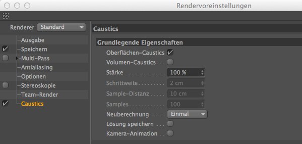 - Ist die Option Caustics in den Rendervoreinstellungen, bei den Lichteinstellungen des Spots und im Illuminations-Kanal des Material-Editors des entsprechenden Materials aktiviert?