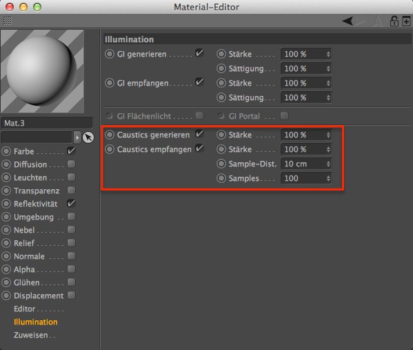 - Hat das causticerzeugende Material mindestens einen der Material-Kanäle Transparenz oder Reflektivität aktiviert?