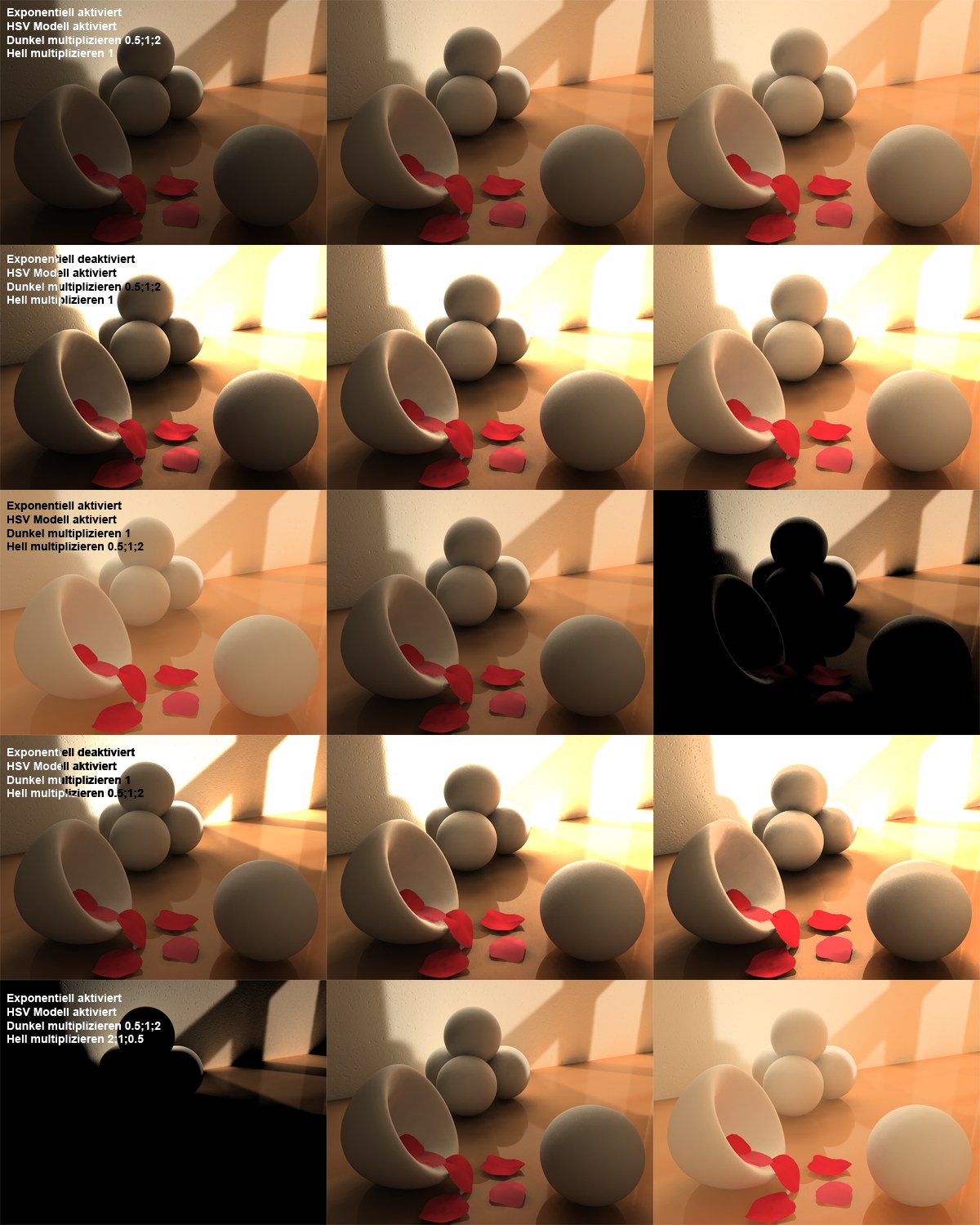 Da dies doch relativ unanschaulich ist, finden Sie im folgenden eine Abbildung mit verschiedenen Werten für beide Parameter. Natürlich können diese Werte bei Ihrer Szene zu anderen Ergebnissen führen; es sollen nur die tendenziellen Auswirkungen der Parameter gezeigt werden.