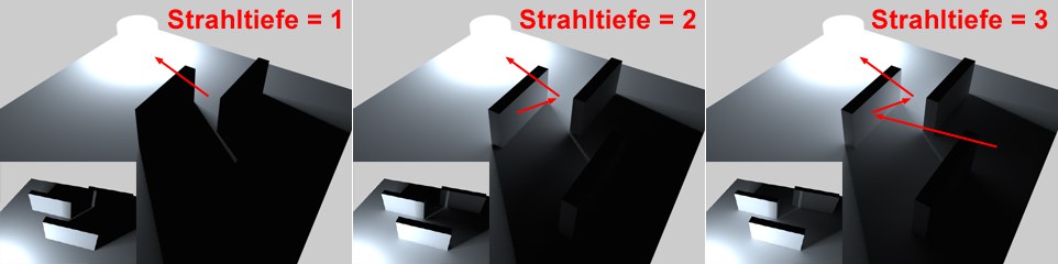 Wachsende Strahltiefen sorgen für realistischere Ergebnisse. Beachten Sie, wie bei Strahltiefe 1 (= deaktivierte Sekundäre Methode) kein Licht hinter die Blenden gelangt.