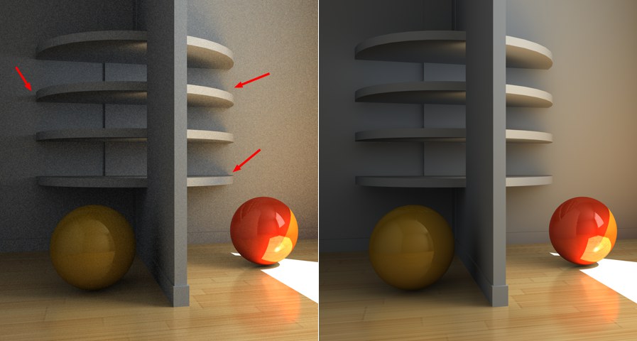 - Die Renderzeiten sind hier maximal (um Größenordnungen höher als bei Irradiance Cache) und da für jedes Pixel ein Helligkeits- und Farbwert aufgrund einer endlichen und zufällig verteilten Anzahl von Strahlen ("Sampleanzahl") ermittelt wird, haben die gerenderten Bilder eine gewisse Körnigkeit, die nur durch hohe Sampleanzahlen, mit entsprechend weiter steigender Renderzeit verringert werden kann. Der Einsatz von Polygonlichtern/GI Portalen (bei Innenraumszenen, wo dass meiste Licht durch Fenster fällt) kann einiges an Renderqualität bringen (was indirekt Renderzeit spart).