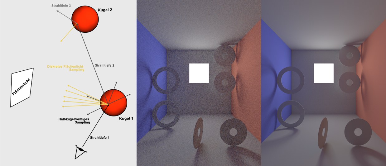 Bei dieser Sampling-Methode werden zusätzliche Strahlen zu (Polygon-)Flächenlichtern gerichtet. Damit werden diese überproportional "beachtet", was sich sehr stark auf die GI-Qualität auswirkt.