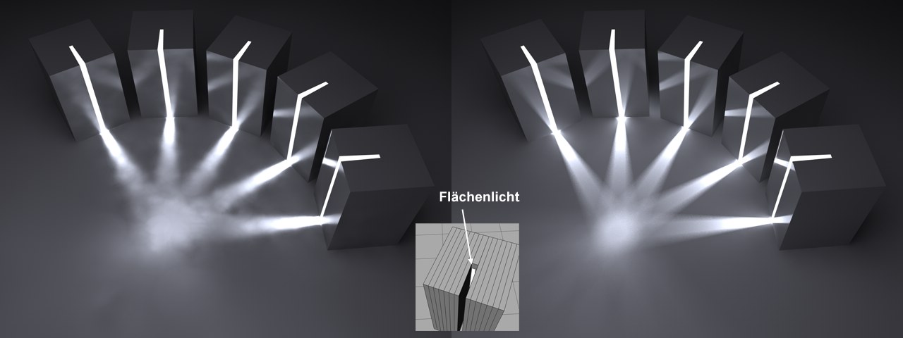 Beachten Sie, dass beim Abschalten der Option NICHT die Flächenlichter aus der GI-Berechnung rausfallen. Sie werden dann nur nicht mehr gesondert betrachtet, sondern zufällig vom halbkugelförmigen Sampler getroffen (mit dann entsprechend körnigem Ergebnis).
