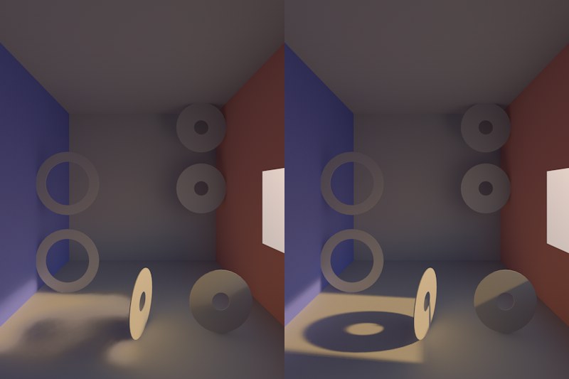 Mitte (Diskretes Flächenlicht-Sampling aktiviert und Diskretes Himmel-Sampling deaktiviert): zusätzlich zu den halbkugelförmigen Strahlen werden eine Reihe von Strahlen in Richtung von GI-Portalen/(polygonalen) Flächenlichtern geschickt.