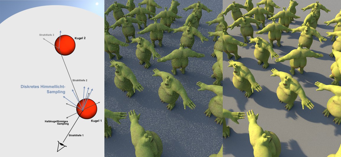 - Rechts (Diskretes Flächenlicht-Sampling und Diskretes Himmel-Sampling aktiviert): zusätzlich zu den halbkugelförmigen Strahlen und den Flächenlicht-Strahlen werden weitere Strahlen in Richtung des Himmels geschickt.