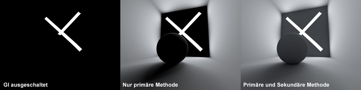 - Die Sekundäre Methode berechnet die Helligkeiten von Oberflächen (die nicht zwangsweise im Kamerablickfeld liegen müssen), die durch mehrfach reflektiertes Licht erhellt werden.