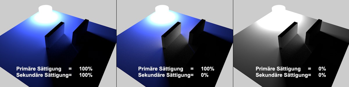 Beachten Sie, wenn Sie Primäre Sättigung auf 0% drehen, für die Sekundär-GI schon keine Farben mehr übrig bleiben.