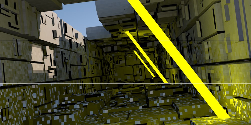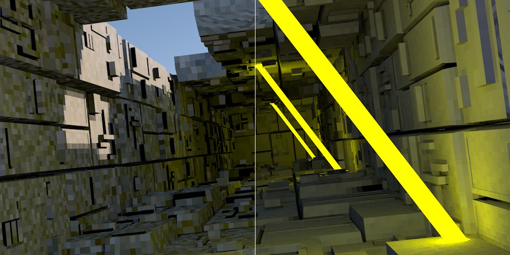 - Die praktische Strahltiefe (Anzahl der diffusen Lichtreflexionen) ist nur noch 1 (2 im Falle von Flächenlichtern und/oder Himmel), das Rendering also dunkler, was aber innerhalb gewisser Grenzen mit einem erhöhten Gamma ausgeglichen werden kann.