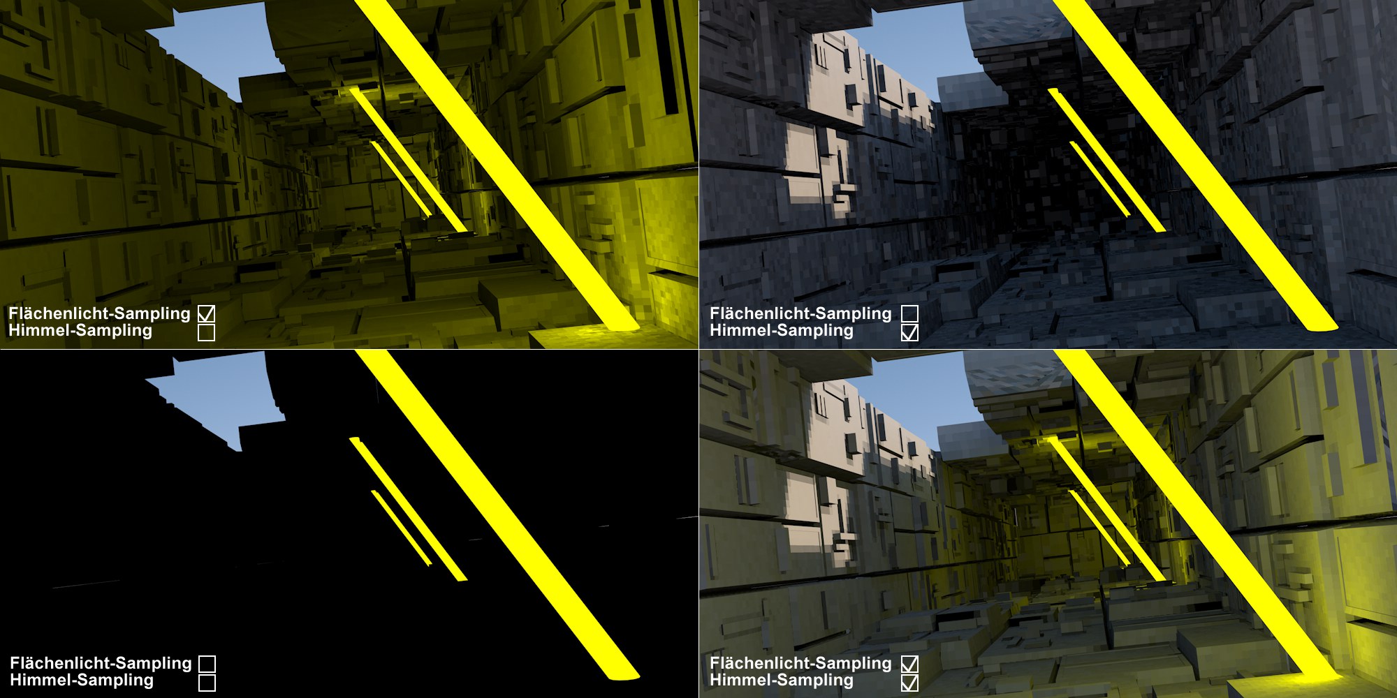 Verschiedene Kombinationen der Optionen Flächenlicht-Sampling und Himmel-Sampling (sichtbar gemacht mit Modus Shading aktivieren).