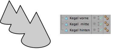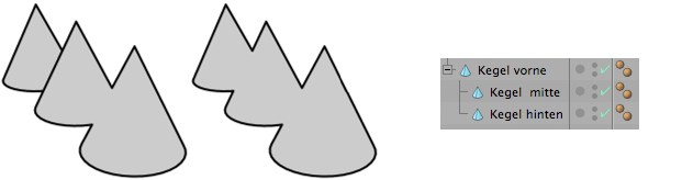 Links Modus Unterobjekte, Mitte Modus Hierarchie. Bei Unterobjekte hat der hintere Kegel einen separaten Umriss, weil er kein Unterobjekt des mittleren Kegel ist.