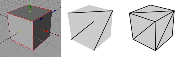 Ein Würfel mit aktiviertem Triangulieren (Mitte) und Triangulieren / Kanten (rechts).