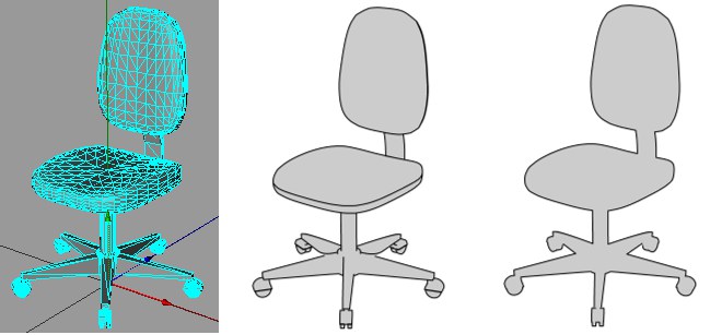 Diese drei Linientypen – Umriss, Falten und Überlappungen – sind als Silhouetten-Linien bekannt. Sie sind an jeder Polygonkante zu finden, wo das Polygon einer Seite (Vorderseite) zur Kamera und das Polygon der anderen Seite (Rückseite) von der Kamera wegzeigt.