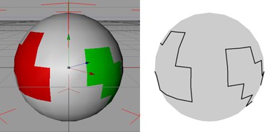 Material-Linien sind die Polygonkanten von Materialien, die auf eine Polygon-Selektion beschränkt sind oder die Kanten um Alpha-Maps herum ("harte" Alphas funktionieren am besten).