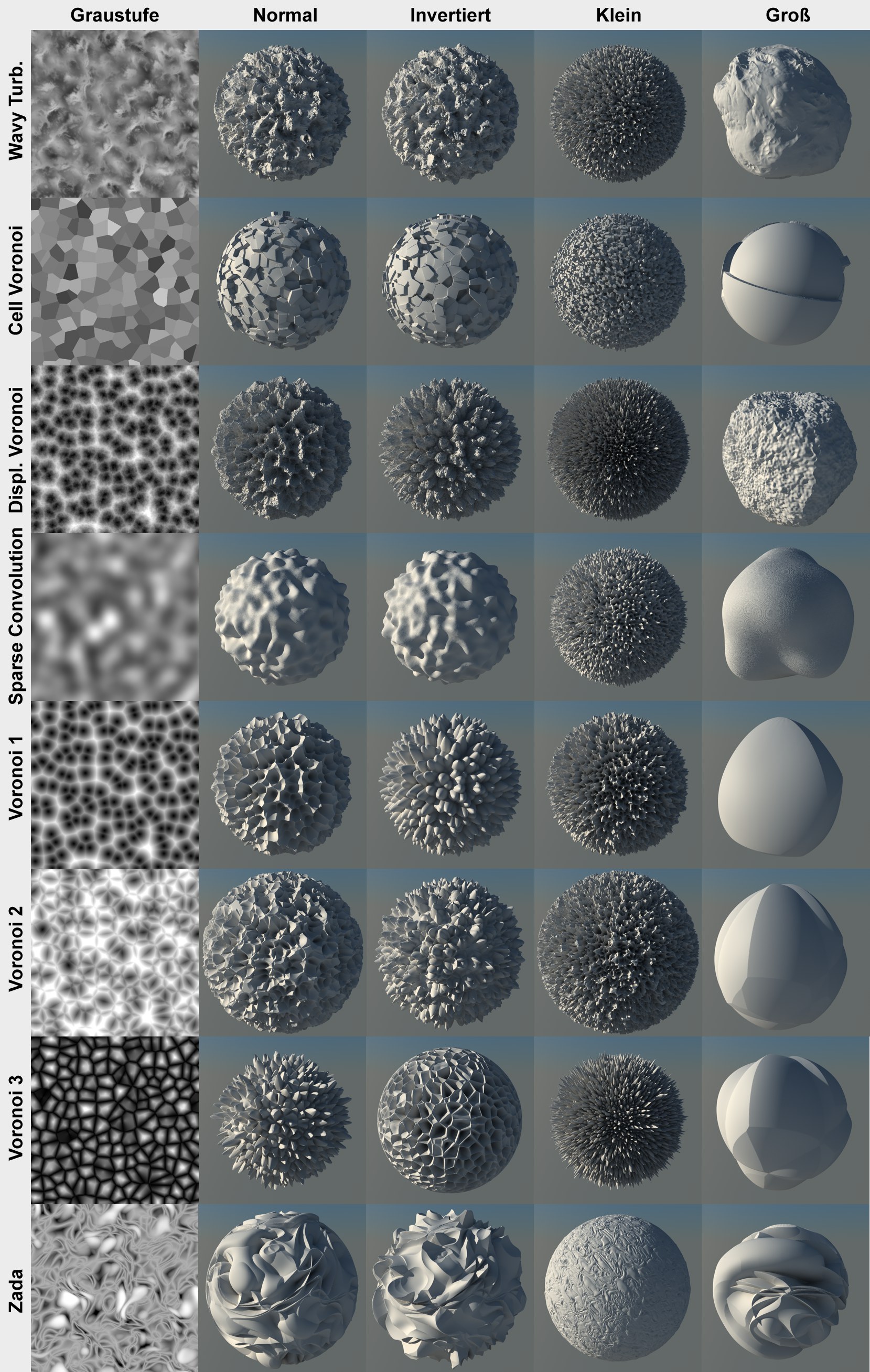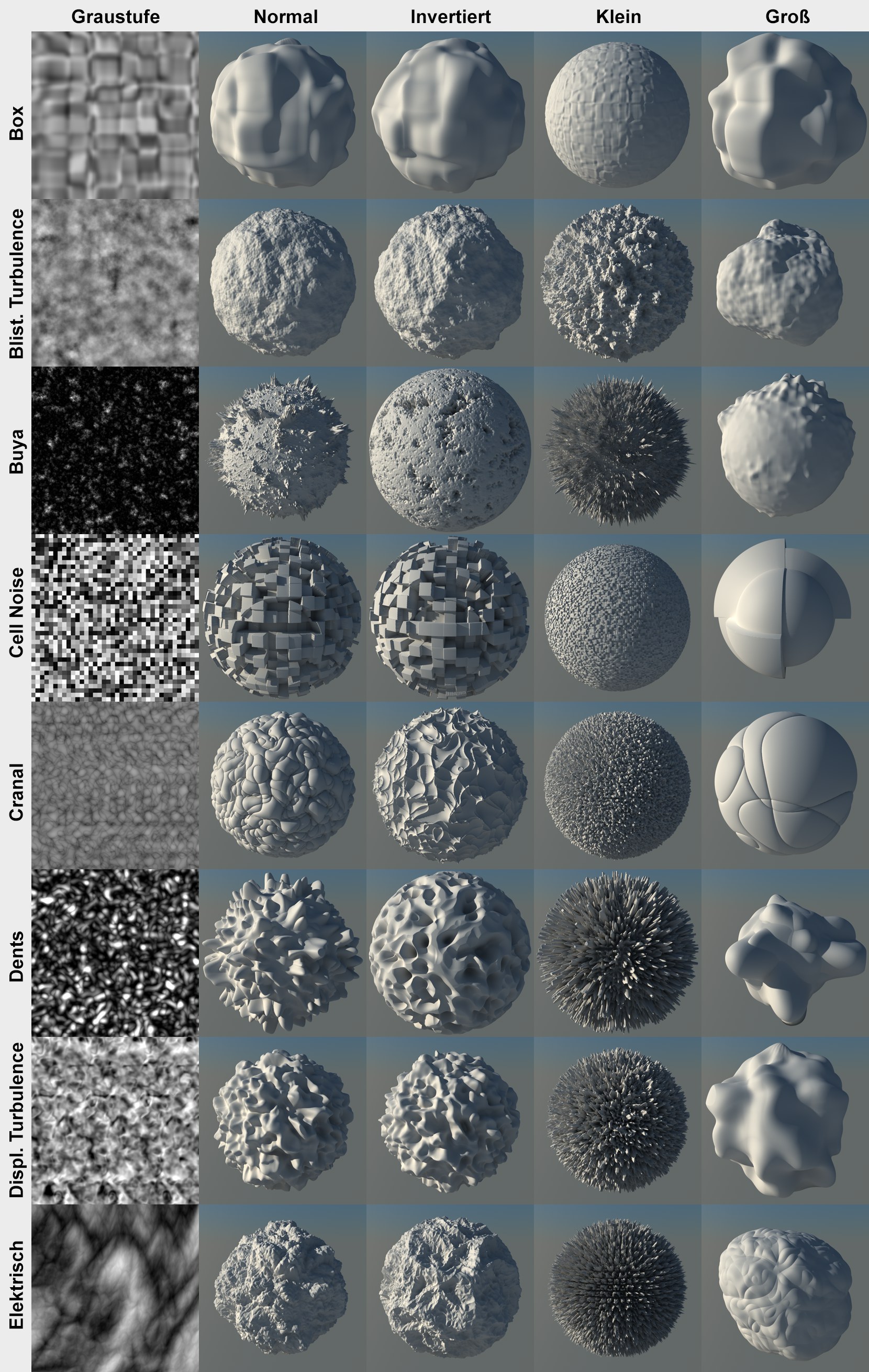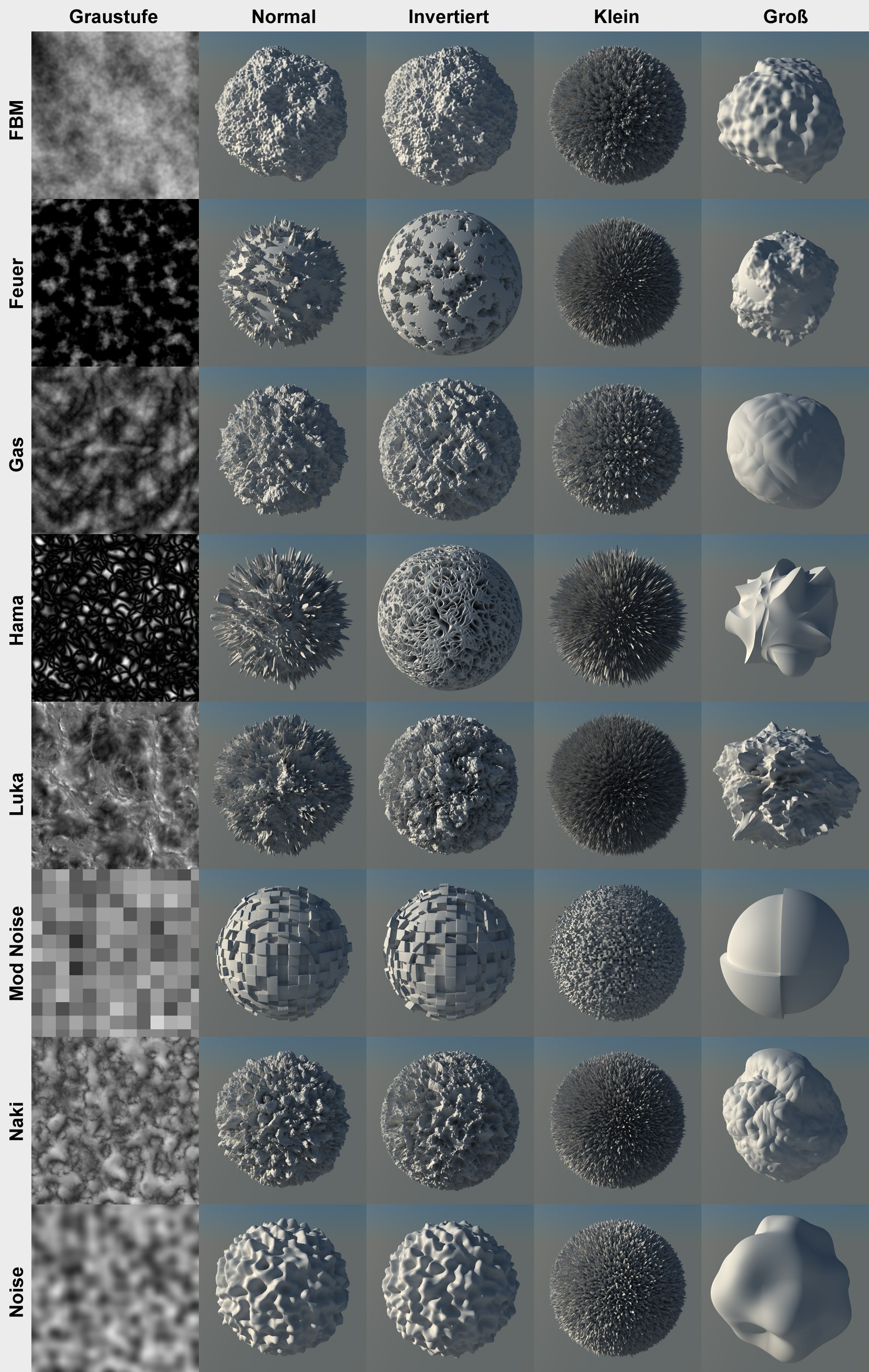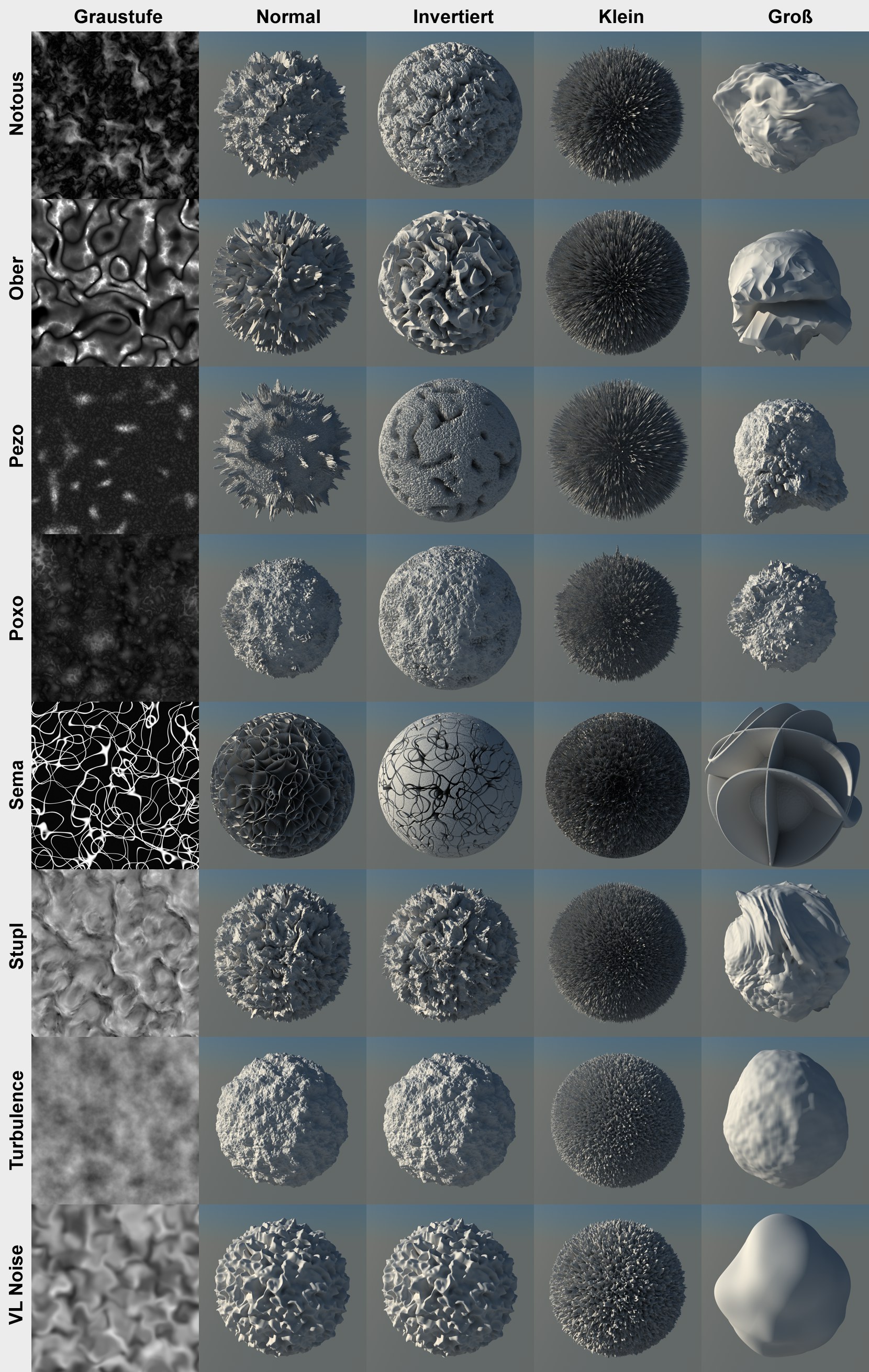 Im Folgenden sind die im Noise-Shader vorhandenen Noisetypen abgebildet und ihre Auswirkungen mittels des Effektes Sub Polygon Displacement sichtbar gemacht.