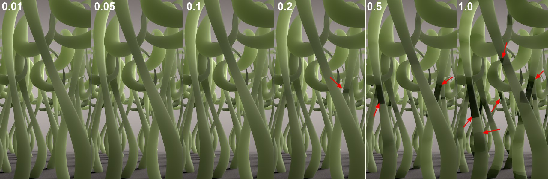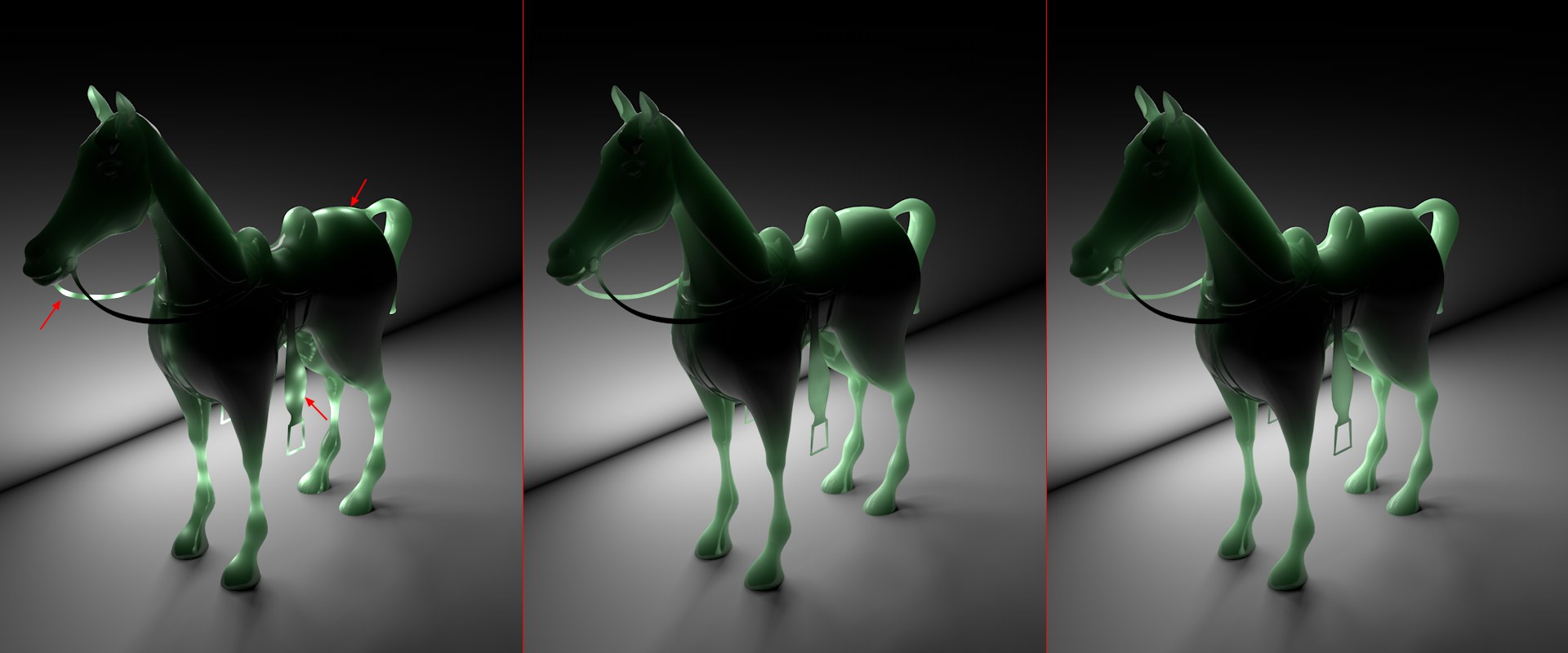 Darüber hinaus gibt es eine 1 Millionen-Punktgrenze für ein SSS-Objekt. Übersteigt die Punktanzahl diese Grenze, kann es besonders bei kleinen Pfadlängen zu Artefakten kommen. In diesem Fall sollten Sie Pfadlänge und/oder Glätten erhöhen.
