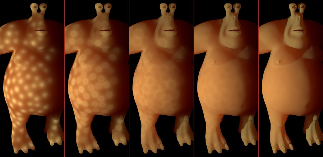 Beim Berechnen von SSS werden eine Anzahl Samples gleichmäßig auf der Objektoberfläche ermittelt und dann deren Helligkeit berechnet. In einem zweiten Schritt werden diese Samples flächig mit ihren Nachbarn verrechnet.